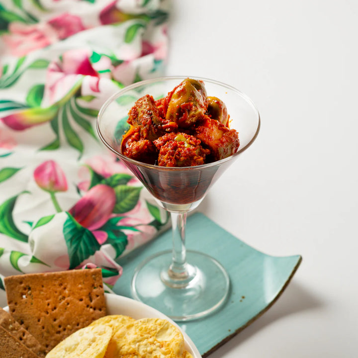 Made from the uniquely textured Gunda (Fragrant Manjack) 🍒 and the timeless tang of raw mango 🥭, this pickle is lovingly stuffed and pickled with a bold blend of Indian spices and cold-pressed sesame oil 🛢️.