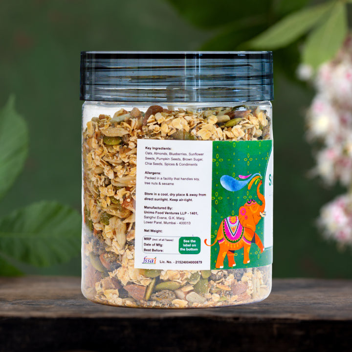 Give your day a refreshing boost with Revive, a wholesome mix of Oats, Almonds, Blueberries, and Super Seeds blended with natural spices.